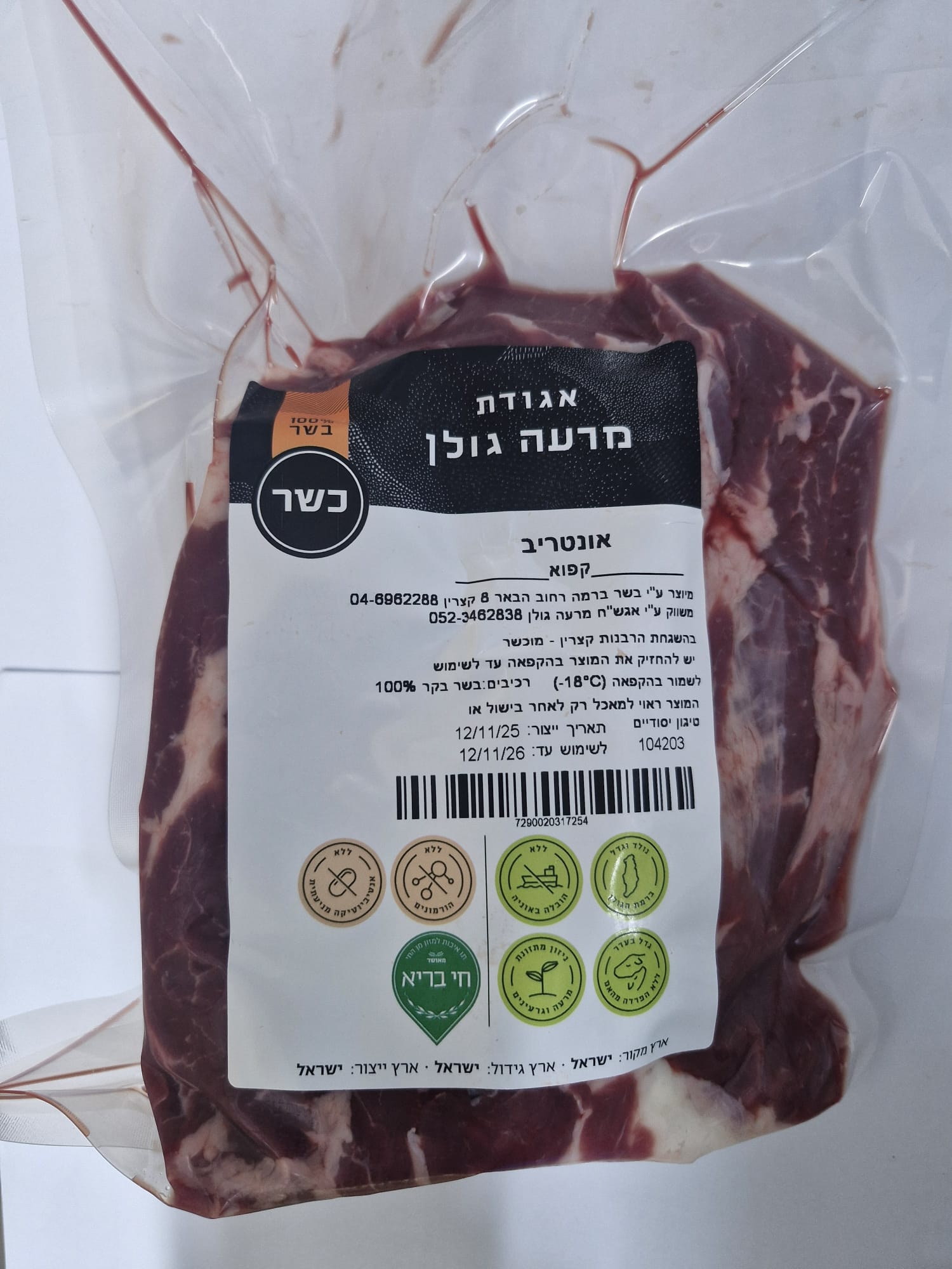 נולד וגדל ברמת הגולן | ללא הובלה באוניה | ללא הורמונים | ללא אנטיביוטיקה מניעתית | גדר בעדר ללא הפרדה מהאם | ניזון מתזונת מרעה וגרעינים | תן איכות למזון מן החי - חי בריא