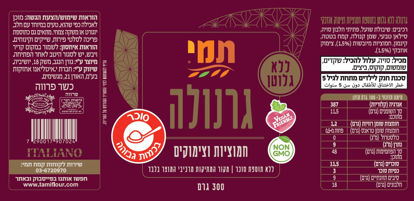 רכיבים: שיבולת שועל, פתיתי חלבון סויה, סילאן טבעי, שמן קנולה, קמח בטטה, קינמון, חמוציות מיובשות (1.5%), צימוק אוזבקי (1.5%).