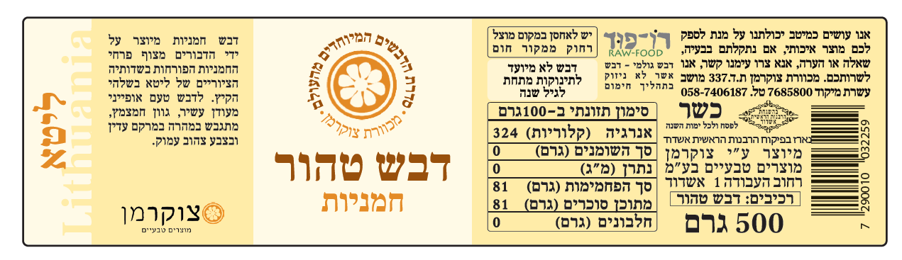 אנרגיה 324 קל' / סך השומנים 0 גר' / נתרן 0 מ"ג / סך הפחמימות 81 גר' / מתוכן סוכרים 81 גר' / חלבונים 0 גר'