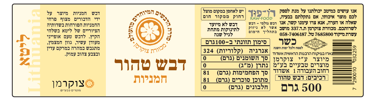 אנרגיה 324 קל' / סך השומנים 0 גר' / נתרן 0 מ"ג / סך הפחמימות 81 גר' / מתוכן סוכרים 81 גר' / חלבונים 0 גר'