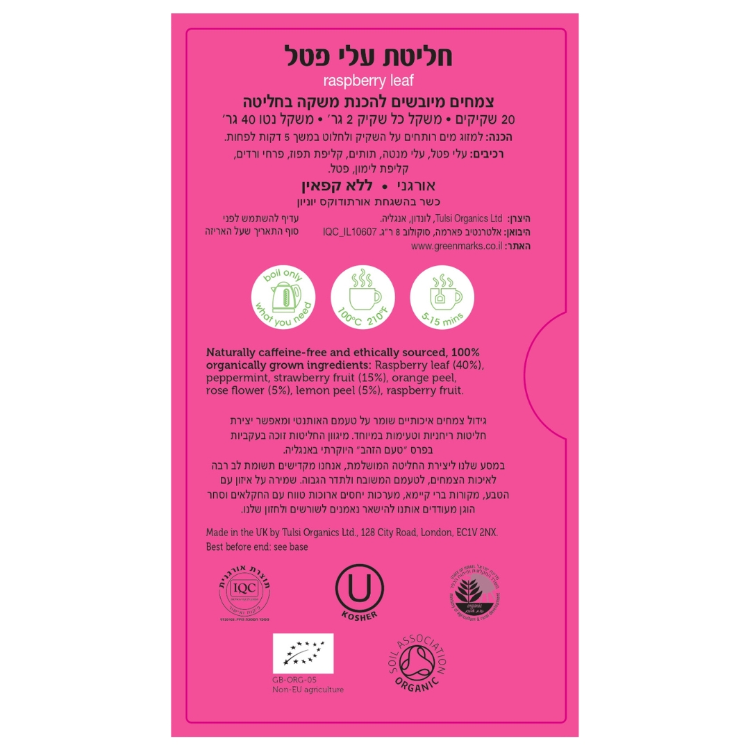 רכיבים: עלי פטל, עלי מנטה, תותים, קליפת תפוז, פרחי ורדים, קליפת לימון, פטל.