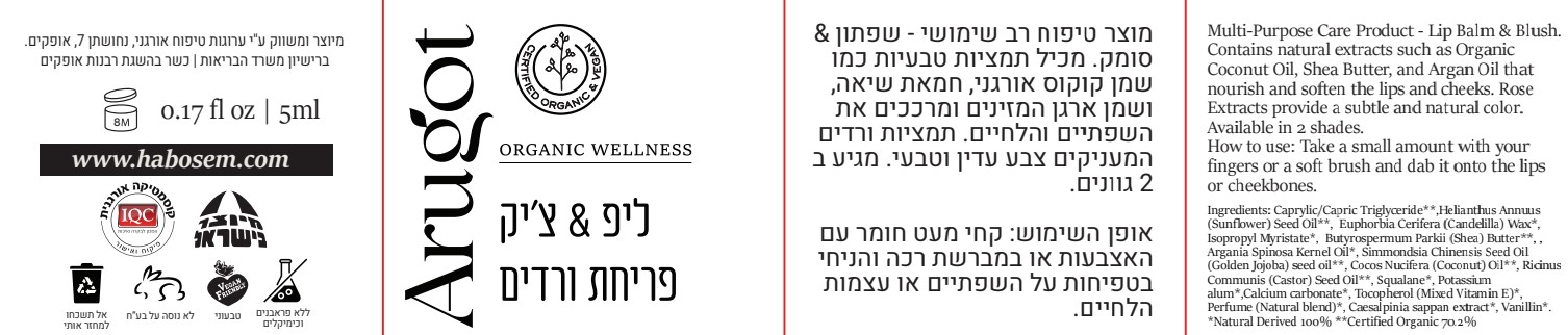 מוצר טיפוח רב שימושי - שפתון וסומק. מכיל תמציות טבעיות כמו שמן קוקוס אורגני, חמאת שיאה ושמן ארגן המזינים ומרככים את השפתיים והלחיים. תמציות ורדים המעניקים צבע עדין וטבעי, מגיע ב-2 גוונים.