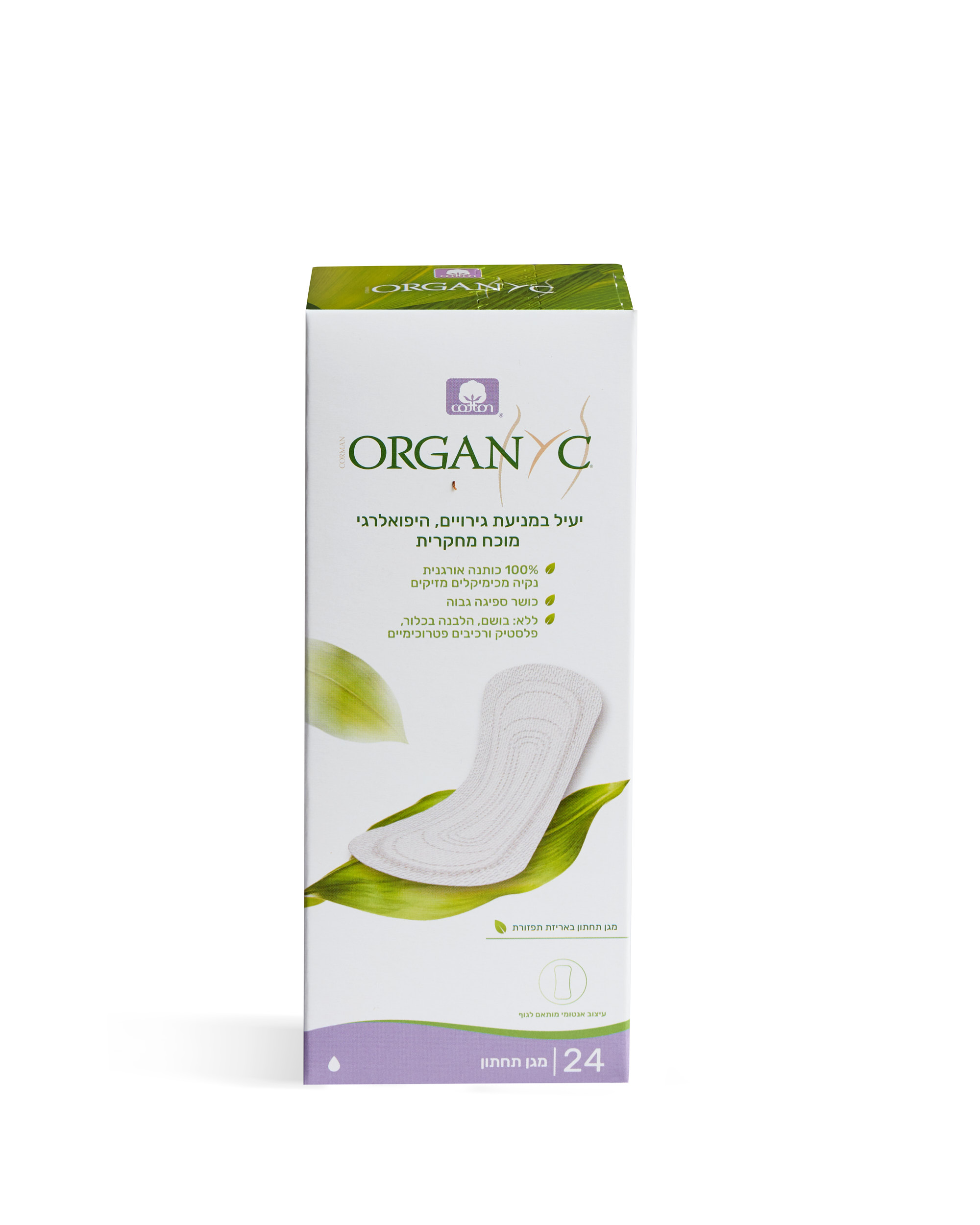 מגן תחתון של Organyc מ100% כותנה אורגנית. יעיל במניעת גירויים, מתאים לעור רגיש, היפואלרגני נבדק דרמטולוגית, נושם, בעל ph נייטרלי ומספק נוחות ובטיחות מירביים. ללא מרכיבי ספיגה פטרוכימיים, נטול בושם, ללא לטקס או פלסטיק, ללא כלור. מוצרי אורגניק נמצאו כטיפול משלים ומונע ל: דלקת נרתיקית כרונית, קנדידה, זיהומים נרתיקיים ודלקות חיצוניות הנגרמות ממגע ואלרגיה. מכילים מעל 96% חומרים מתכלים, לא נוסה על בע"ח. 24 יחידות.