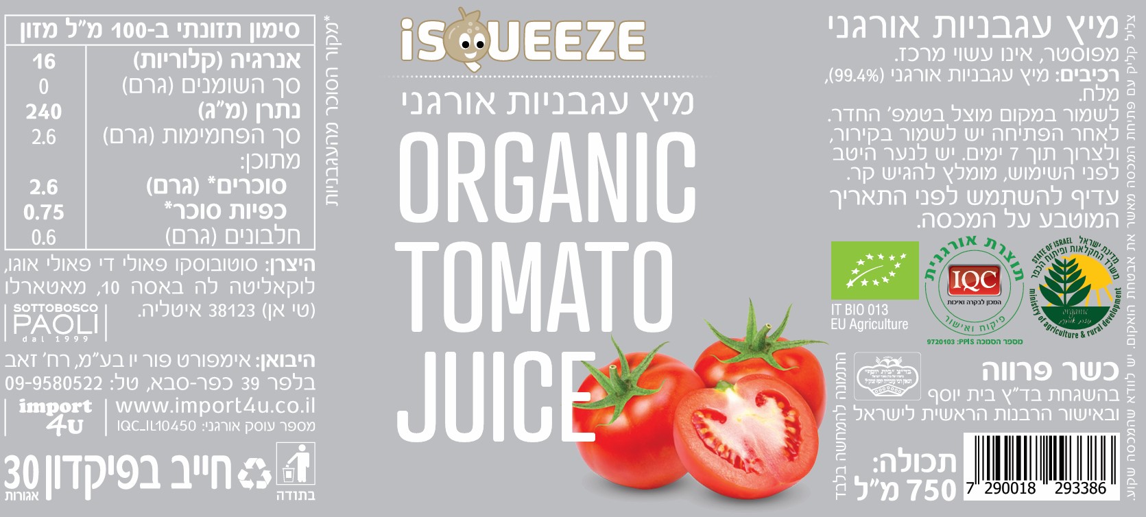 רכיבים: מיץ עגבניות אורגני (99.4%), מלח.