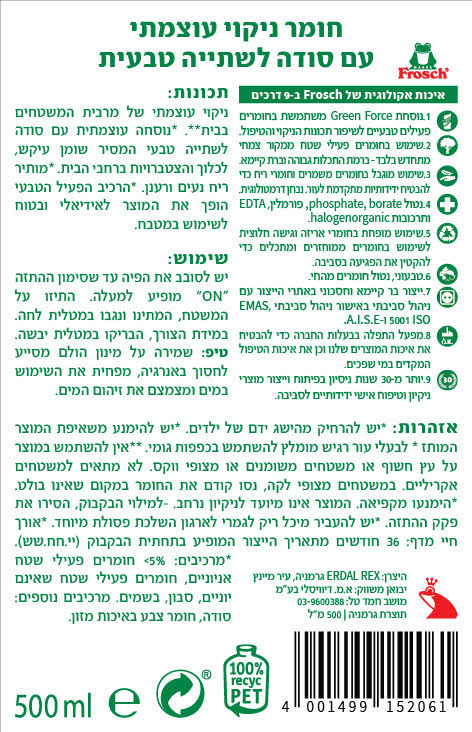 פחות מ־5% חומרים פעילי שטח אניוניים פחות מ־5% חומרים פעילי שטח לא־יוניים חומרי ריח מרכיבים נוספים: סודה (Sodium Bicarbonate), חומרי צבע בכמויות מזעריות