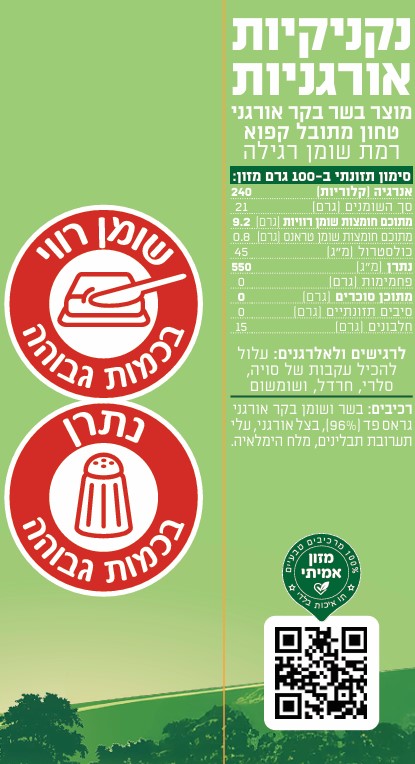 רכיבים: בשר ושומן בקר אורגני גראס פד (96%), בצל אורגני, עלי תערובת תבלינים, מלח הימלאיה