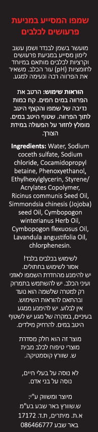 הוראות שימוש: השתמשו במים חמימים, מרחו את הכמות הרצויה של השמפו ועסו בעדינות לתוך העור והפרווה, בסיום החפיפה שטפו במים חמימים.