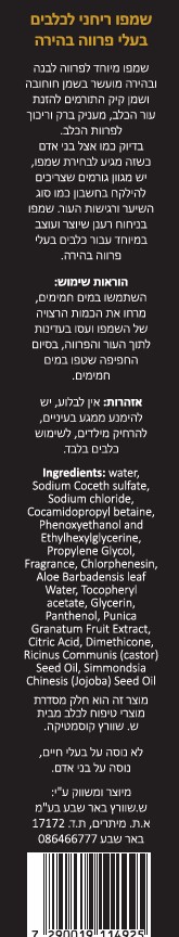 שמפו מיוחד לפרווה לבנה ובהירה מועשר בשמן חוחובה ושמן קיק התורמים להזנת עור הכלב. מעניק ברק וריכוך לפרוות הכלב.