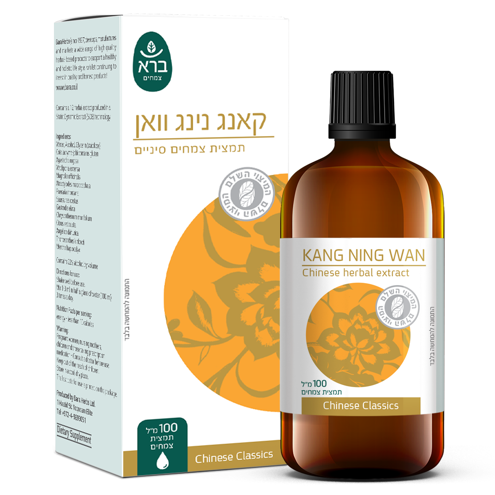 רכיבים: Tian Ma | Gastrodia elata Ju Hua | Chrysanthemum morifolium Bo He | Mentha haplocalyx Chen Pi | Citrus reticulata Mu Xiang | Saussurea costus Tian Hua Fen | Trichosanthes kirilowii Bai Zhu | Atractylodes macrocephala Huo Xiang | Agastache rugosa Ge Gen | Pueraria montana Bai Zhi | Angelica dahurica Fu Ling | Wolfiporia extensa Yi Yi Ren | Coix lacryma Hou po | Magnolia officinalis KANG NING WAN PANDA בטכנולוגיית מיצוי סטטי דינאמי: הפורמולה מיוצרת במכונת מיצוי חדשנית ומוגנת פטנט אשר פותחה במיוחד עבור חברת ברא צמחים. המכונה מאפשרת מיצוי מיוחד בשיטה מהפכנית, המייעלת ומאיצה את תהליך ההפקה של חומרים פעילים מהצמח, באופן איכותי ומבוקר. תהליך ההפקה מאפשר לכם ליהנות ממוצר סופי צלול, מרוכז ונקי במיוחד, המכיל את מקסימום הרכיבים הפעילים המצויים בצמח, ללא שינוי בהרכבם וללא פגיעה ברמת האיזון הטבעי והנכון שביניהם – "בדיוק כפי שהטבע תכנן". יתרונות המוצר KANG NING WAN PANDA: מבוססת על מרשם סיני קלאסי בעל ניסיון של מאות שנים. תמצית נוזלית לספיגה יעילה, קלה ומהירה! הפורמולה מיוצרת בטכנולוגיה המתקדמת של מיצוי סטטי דינאמי, באיכות מעולה ושמירה על מקסימום הרכיבים הפעילים בצמח באופן מרוכז ואיכותי במיוחד! הצמחים שבפורמולה עברו סדרת בדיקות איכות, בהתאם לתקנים המחמירים ביותר, כדי להבטיח את זיהויים, איכותם וניקיונם. המוצר אינו מכיל חומרים משמרים, תוספת סוכר או ממתיקים מלאכותיים. מתאים גם לצמחונים ולטבעונים! כשרות בד"צ חתם סופר בני ברק! אופן השימוש: מבוגרים: 1-3 מזלפים עם מים, 3 פעמים ביום. על פי הצורך ניתן להעלות את המינון ל: 3 מזלפים, כל 4 שעות. עד 50 ק"ג : מזלף אחד לכל 10 ק”ג ממשקל הגוף. ניתן להכפיל את המינון על פי הצורך.