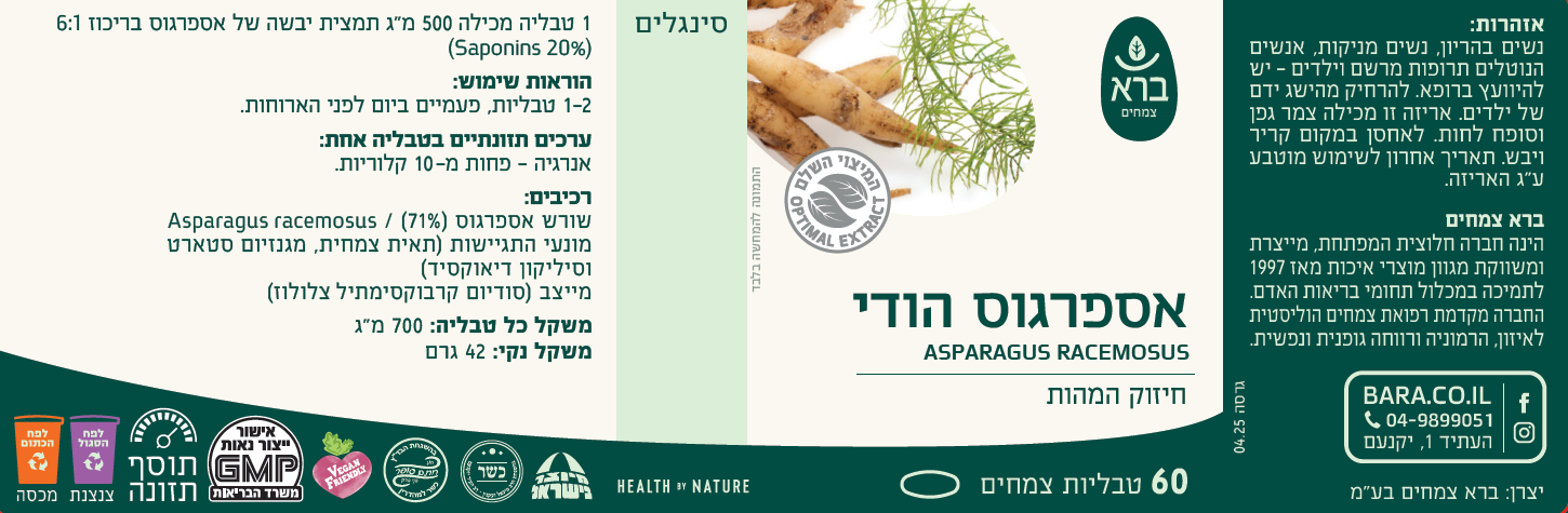 רכיבים: שורש אספרגוס (71%) / Asparagus Racemosus מונעי התגיישות (תאית צמחית, מגנזיום סטארט וסיליקון דיאוקסיד) מייצב (סודיום קרבוקסימתיל צלולוז)