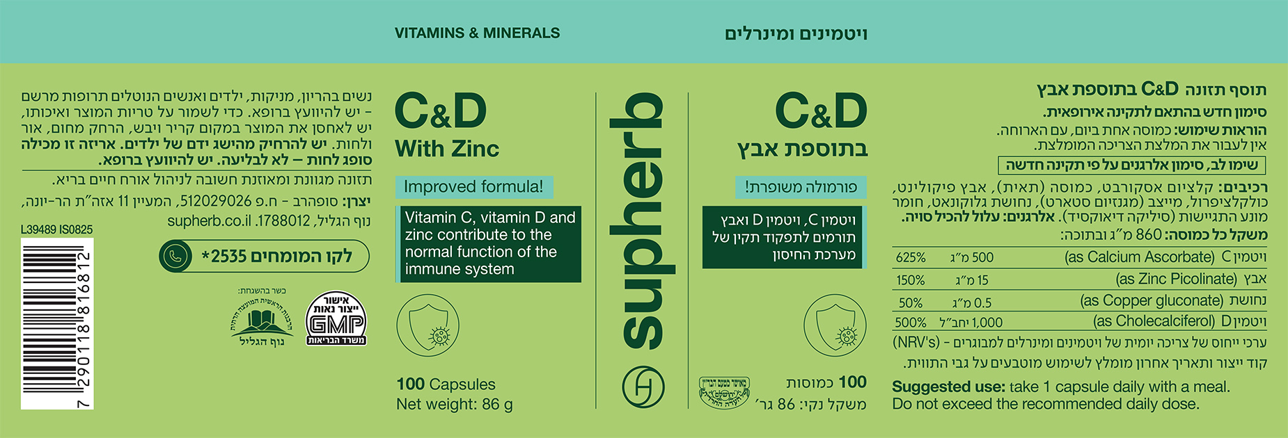 רכיבים: קלציום אסקורבט, כמוסה (תאית), אבץ פיקולינט, כולקלציפרול, מייצב (מגנזיום סטארט), נחושת גלוקונאט, חומר מונע התגיישות (סיליקה דיאוקסיד), אלרגנים: עלול להכיל סויה.