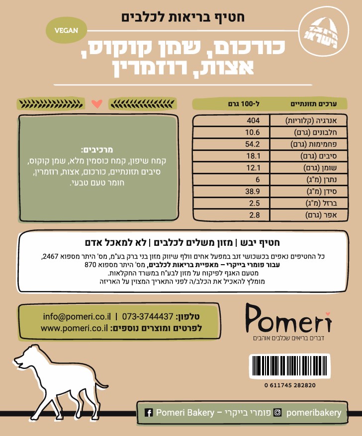 רכיבים: קמח שיפון, קמח כוסמין מלא, שמן קוקוס, סיבים תזונתיים, כורכום, אצות, רוזמרין, חומר טעם טבעי