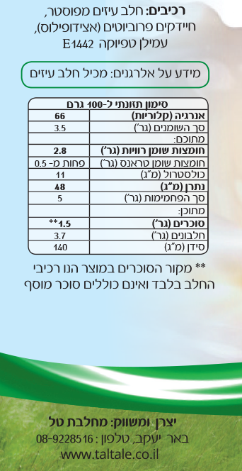 רכיבים: חלב עיזים מפוסטר, חיידקים פרוביוטים (אצידופילוס), עמילן טפיוקה E144