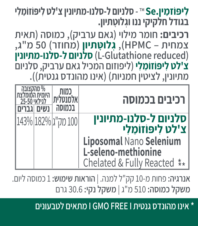 רכיבים: חומר מילוי (גאם ערביק), כמוסה (תאית צמחית -HPMC), גלוטתיון (מחוזר) 50 מ"ג, סלניום ל-סלנו-מתיונין צ'לט ליפוזומלי (ליפוזום המכיל גאם ערביק, סלניום מתיונין, לציטין חמניות) (אינו מהונדס גנטית)).