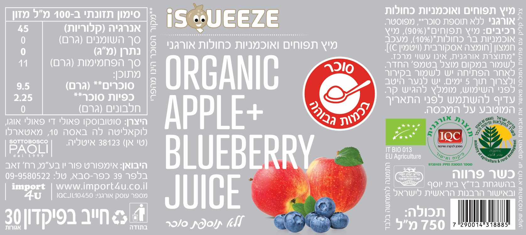 רכיבים: מיץ תפוחים* (90%), מיץ אוכמניות בר כחולות* (10%), מעכב חמצון [חומצה אסקורבית (ויטמין C)].