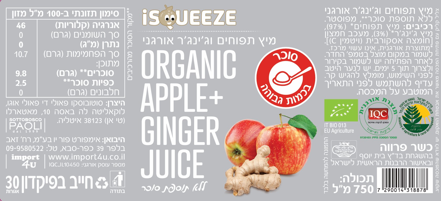 רכיבים: מיץ תפוחים* (97%), מיץ ג'ינג'ר* (3%), מעכב חמצון [חומצה אסקורבית (ויטמין C)].