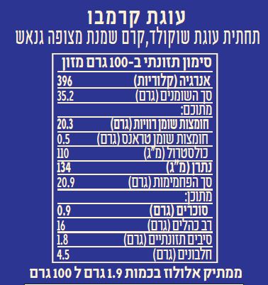 אנרגיה (קלוריות)396,סך השומנים (גרם)35.2,מתוכם:חומצות שומן רוויות (גרם)20.3,חומצות שומן טראנס (גרם)0.5,כולסטרול (מ"ג)110,נתרן (מ"ג)134,סך הפחמימות (גרם)20.9,מתוכן:סוכרים (גרם)0.9,רב כהלים (גרם)16,סיבים תזונתיים (גרם)1.8,חלבונים (גרם)4.5.