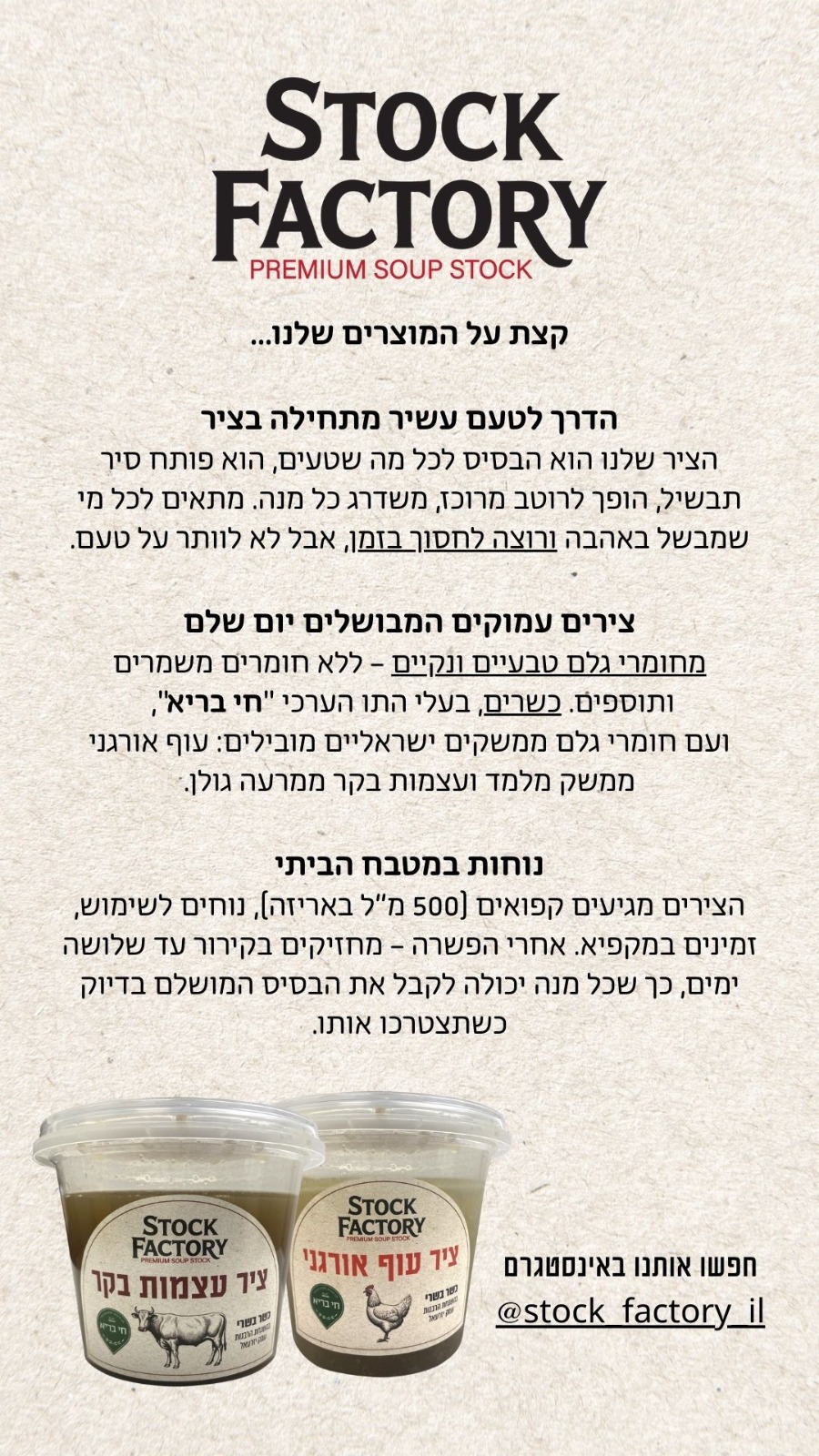 רכיבים: מים, מיצוי ציר (עצמות עוף אורגני, ירקות שורש אורגנים, מלח שולחן).